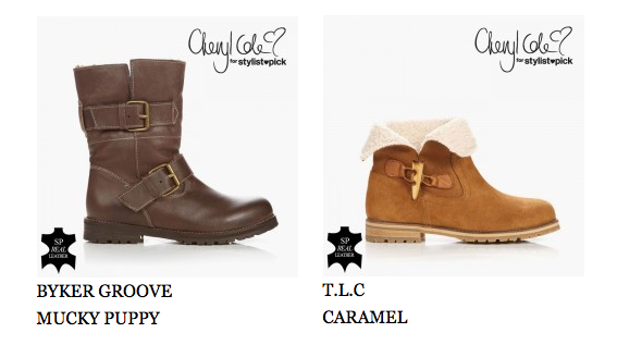 The collection has a few party shoes, the ones above Glam Slam Disco Ball actually make models feet look over-sized due to thin straps and thick heel and platform. A few Autumn/Winter shoe boots are also present but I’m not a fan: I can see that Freak Le Chic boots were inspired by Prada, but I can not imagine the Black and Red strap boots looking good with anything. The only shoes that are worth checking out are Byker Groove Mucky Puppy Boot in brown and T.L.C. flat boots with cuff detail. Those would be good for trip to the country side or to add to your weekend wardrobe, but this is not the designs Cheryl should be promoting – this is her off duty look and hardly many people want to buy Cheryl Cole boots they will wear in their garden.