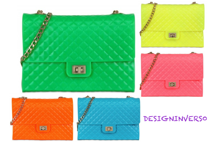 Post after post I have been going on about colour as the most important trend setter of the season. And one colour trend in particular is bright neon shades. Earlier this year I have already blogged about bright handbags but this time I have a new addition to the collection – DesignInverso handbags I discovered at Luisaviaroma.com. At £78 they have the designer feel without the high price tag. What I absolutely love about the range is that they are a clever imitation of infamous Chanel shape – quilted and with a long chain. Where is the clever, you might ask? Well the handbags are PVC and not leather plus the colours are world apart from the usual black and red Chanel flap bags we see everywhere. And that is what makes them fashionable – playful and fun interpretation of one of the most classic bags making it not just practical but totally trendy. So pick your favourite shade and wear it with, well, more or less anything for the fashionably required splash of colour!