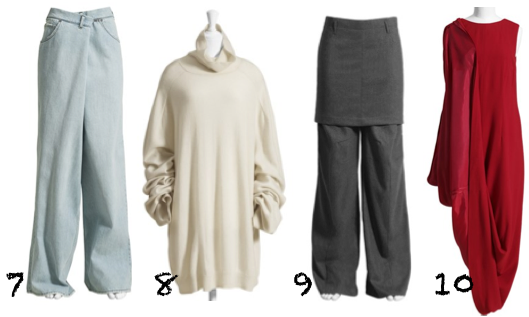 Now, lets move on to the pieces I can not get my head around. 7-10 are probably the most unflattering clothes that have ever been made for women. First let’s have a look at these jeans and jumper. I’m not saying us ladies need to be in skintight clothing at all times, but this oversizing is taking things to the next level. The unwearable level that is. Maybe if I had issues with my weight I would have enjoyed the feeling of wearing clothes at least 10 sizes bigger, but having to actually wrap the jeans around my waist twice and on purpose, does not go down in my morning to do list. Then there is a trouser and mini skirt combo that gives me flashbacks to 90’s. These are not good flashbacks. Some fashion styles should stay in the past forever. And finally – the hitched up dress. In the comments to it, someone said it would be perfect for middle-eastern themed party, but I would not wear one even if I was paid to do it. I do feel sorry for that poor model they hired..