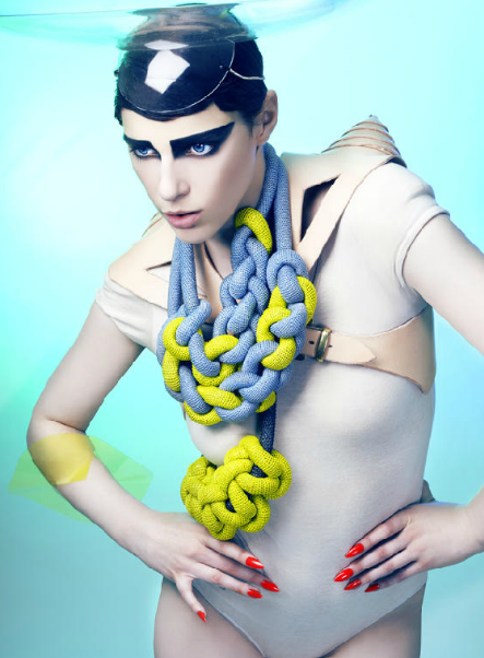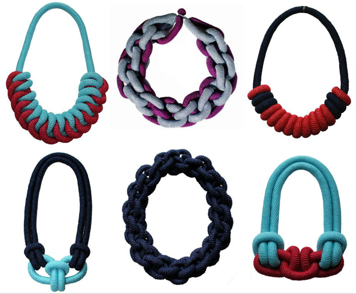 During my chat to Grace Hamilton a few things became clear. Firstly, she is a fun and exciting person and her character reflects well in the jewellery. Secondly, her creations are all about inspiration: shape inspired by love of sculpture and a scene from the fish market where on the display was a box of live eels that were slowly intertwining with each other, while colours come from her travels to distant lands of African continent. And thirdly, she is very meticulous when it comes to her jewellery as every step of the creation process is done with her own hands – from dying the yarn to crocheting each item for days at a time (some of the pieces take 2 days and hence are priced around £295, while others including the central necklaces on the photo above take a week and are around £750).